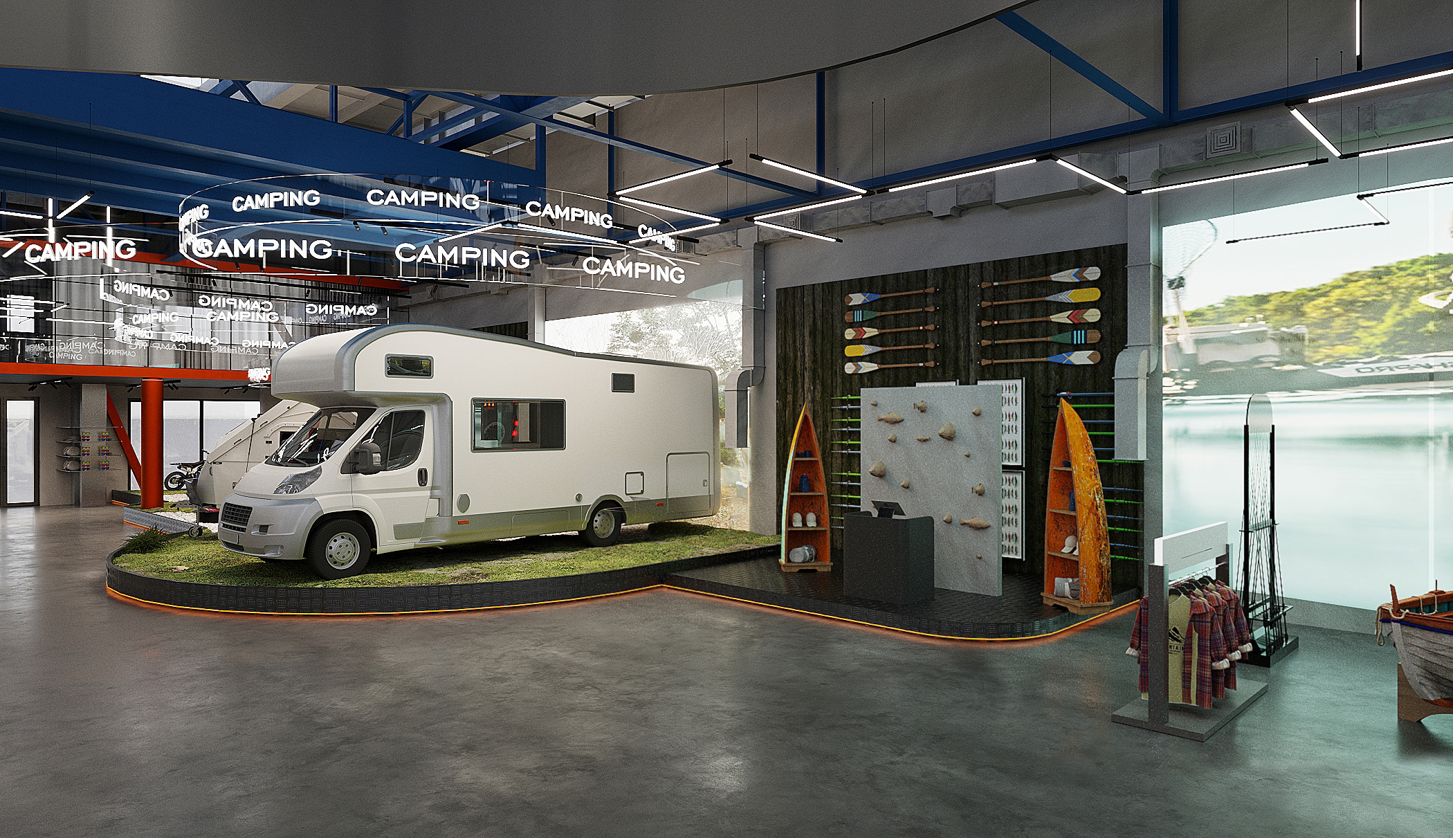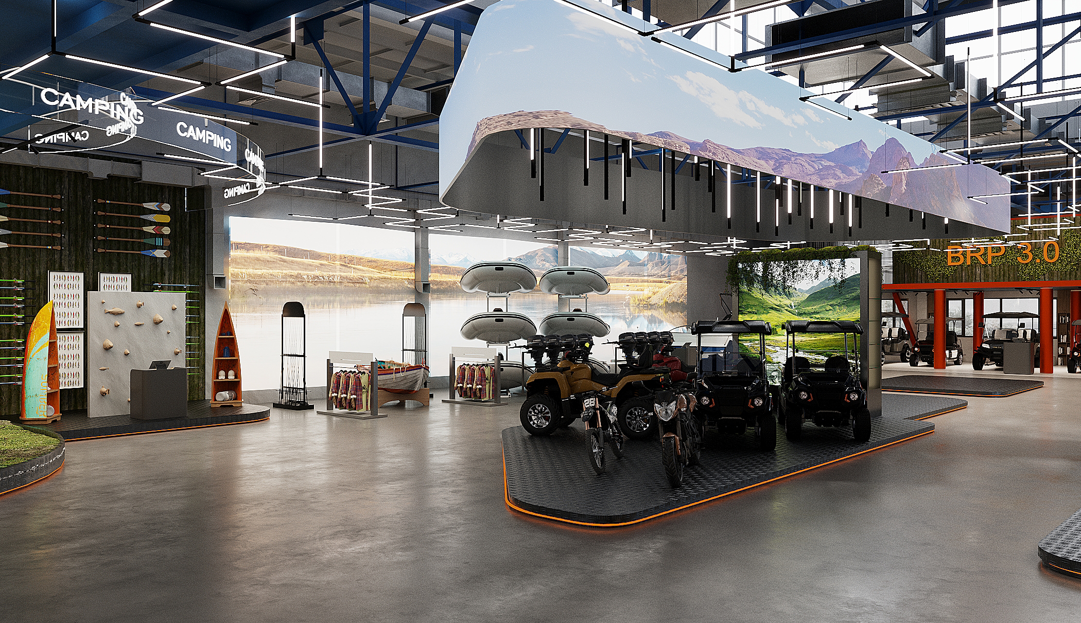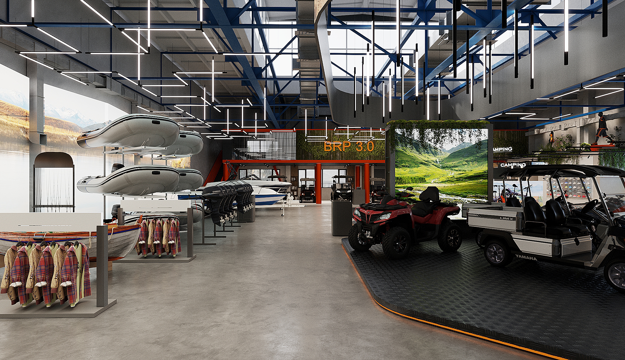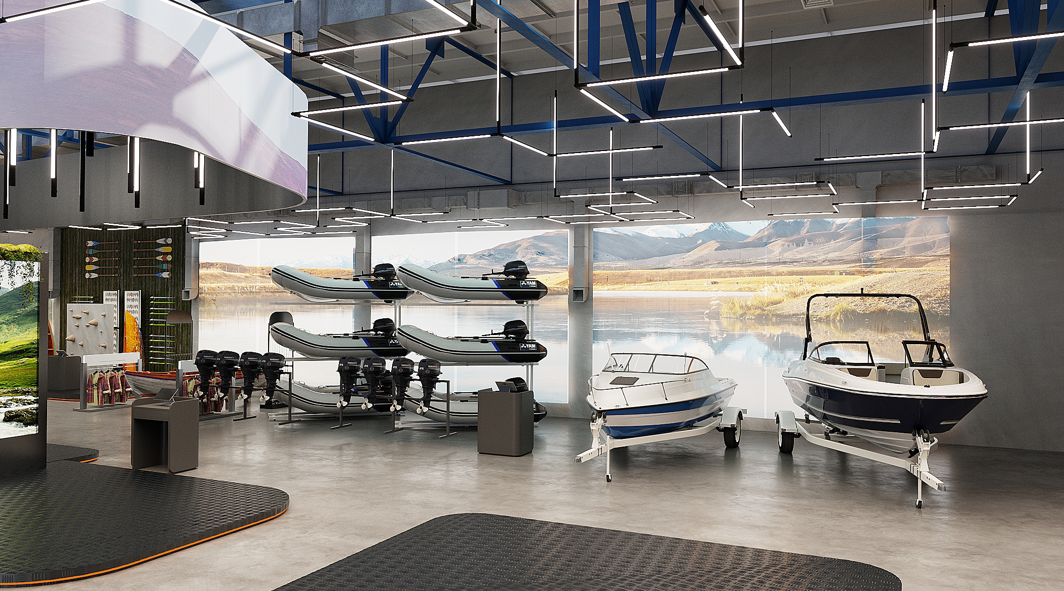 Мы спроектировали торговые площади нового магазина экстремального спорта. Помимо зон демонстрации техники, предусмотрен отдельный блок, посвящённый яхт-клубу