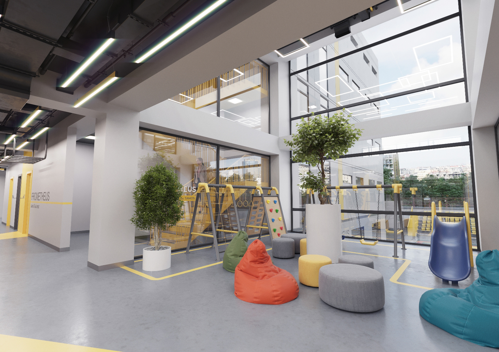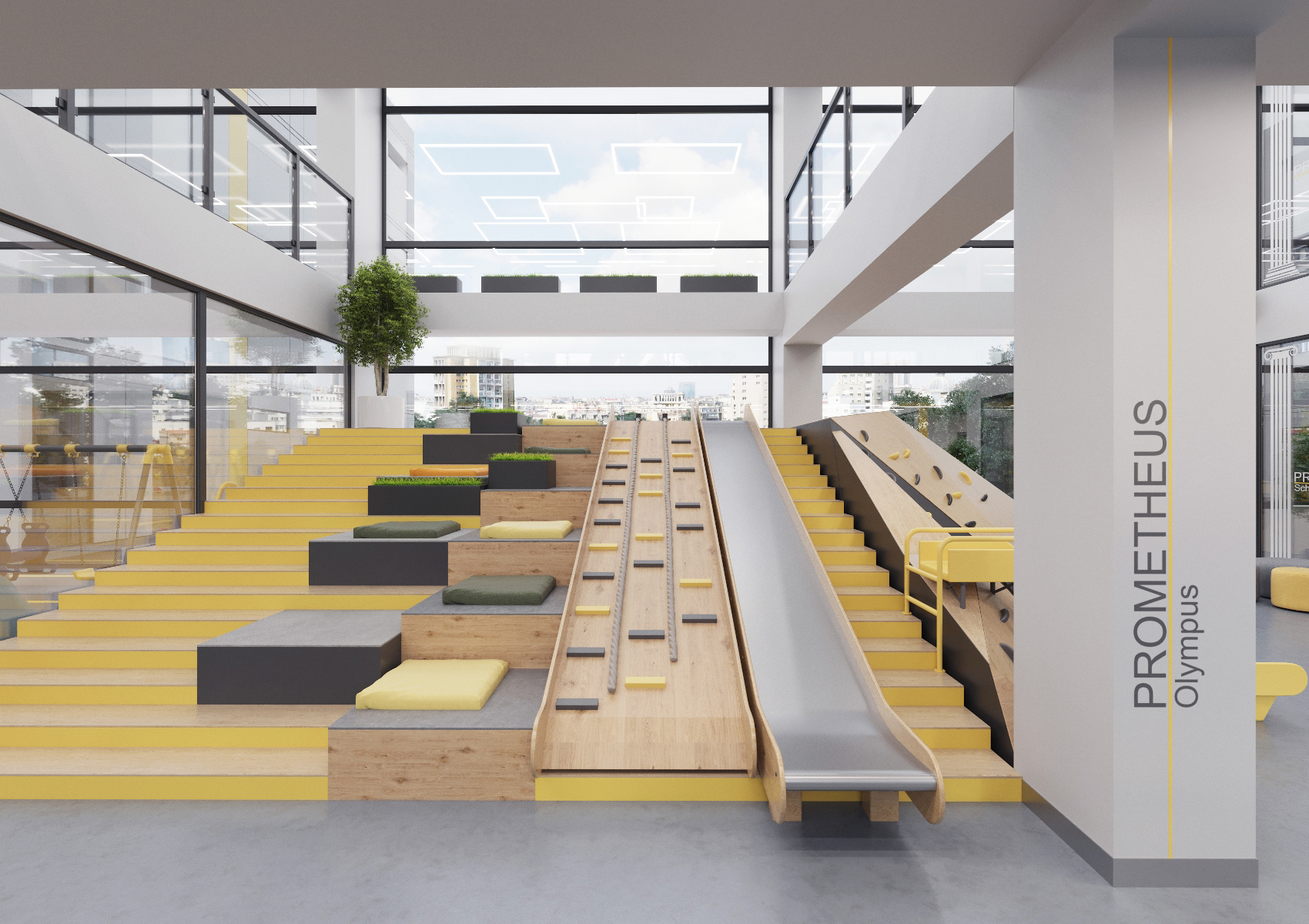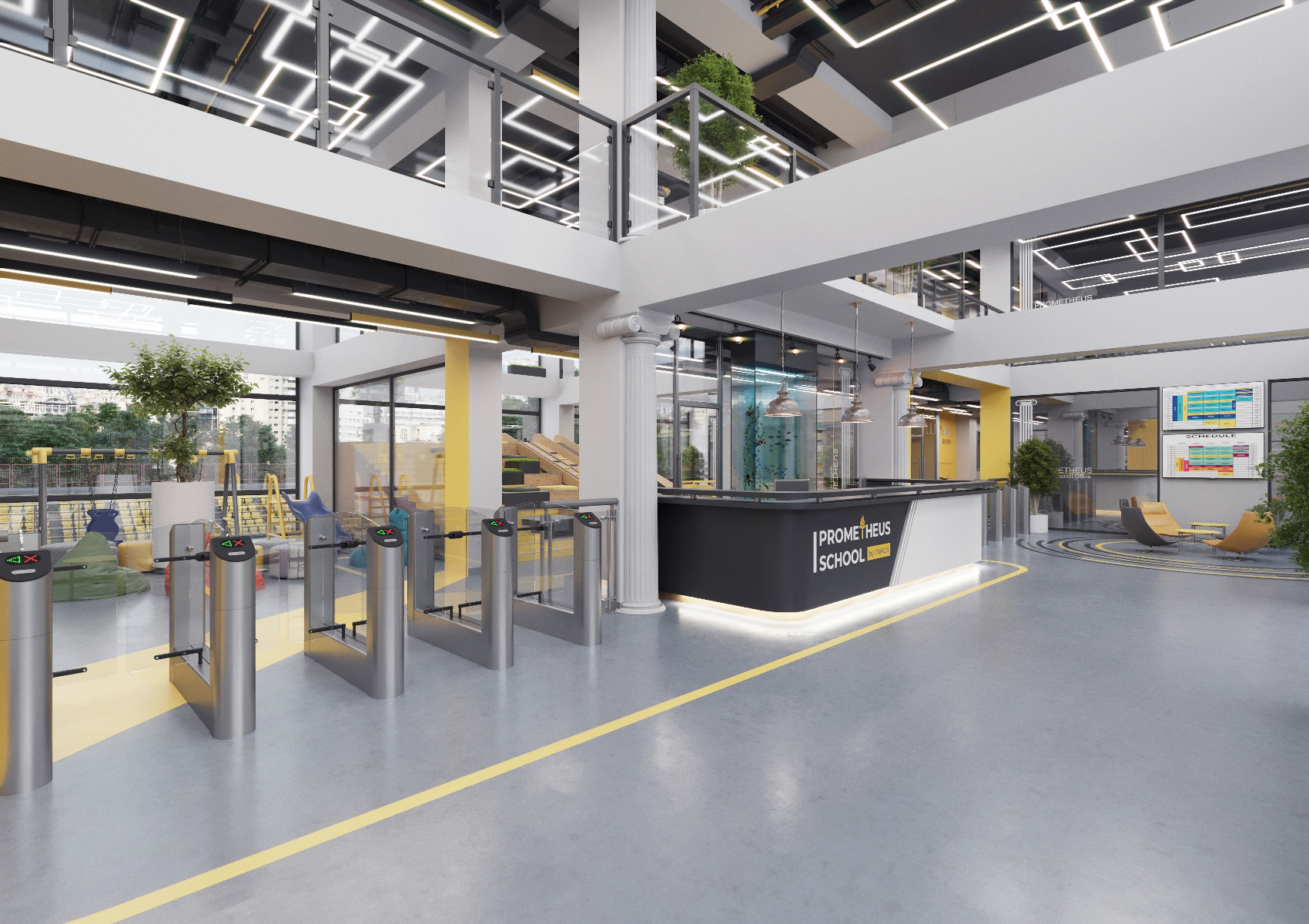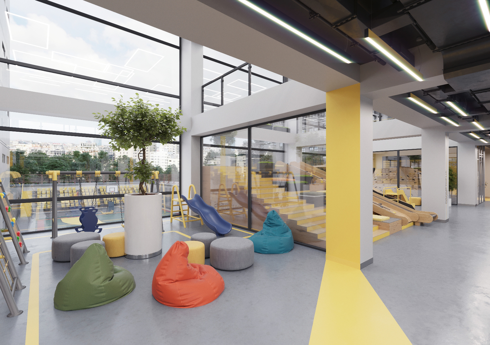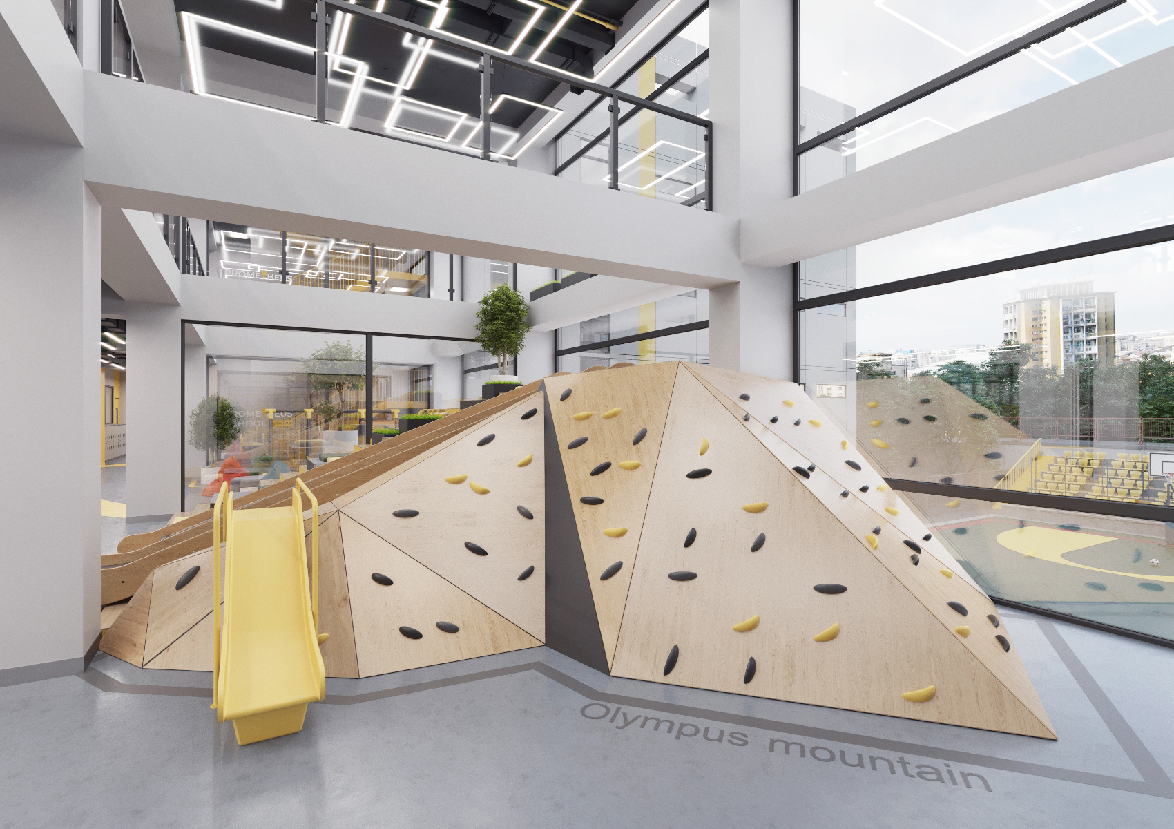 Современная школа, где наряду с комфортом и безопасностью реализованы смелые решения: например, горки-лифты для детей.