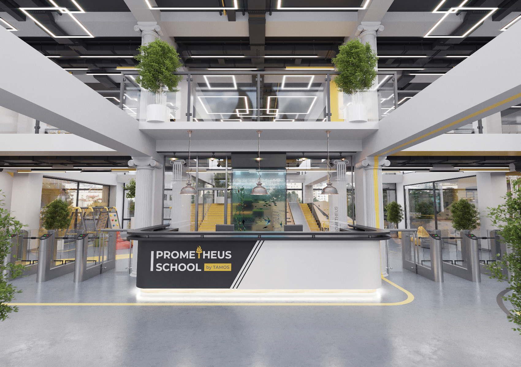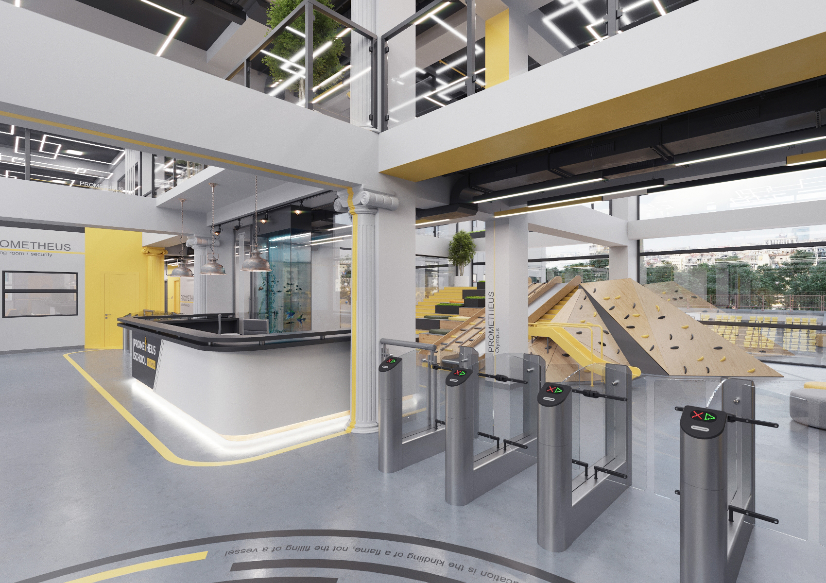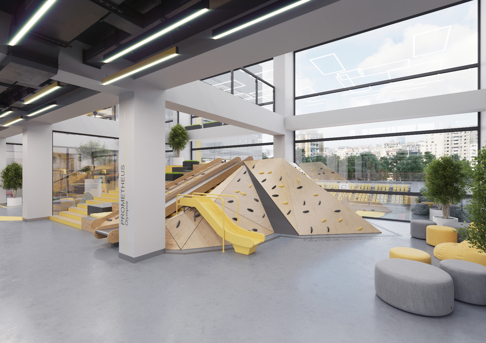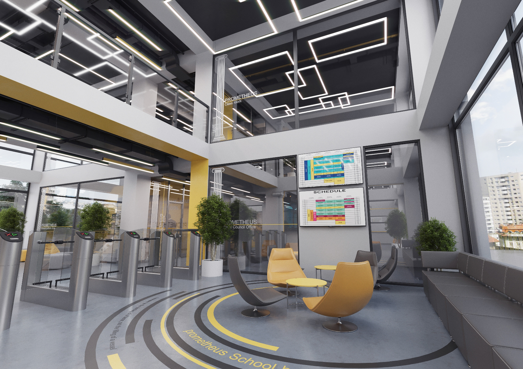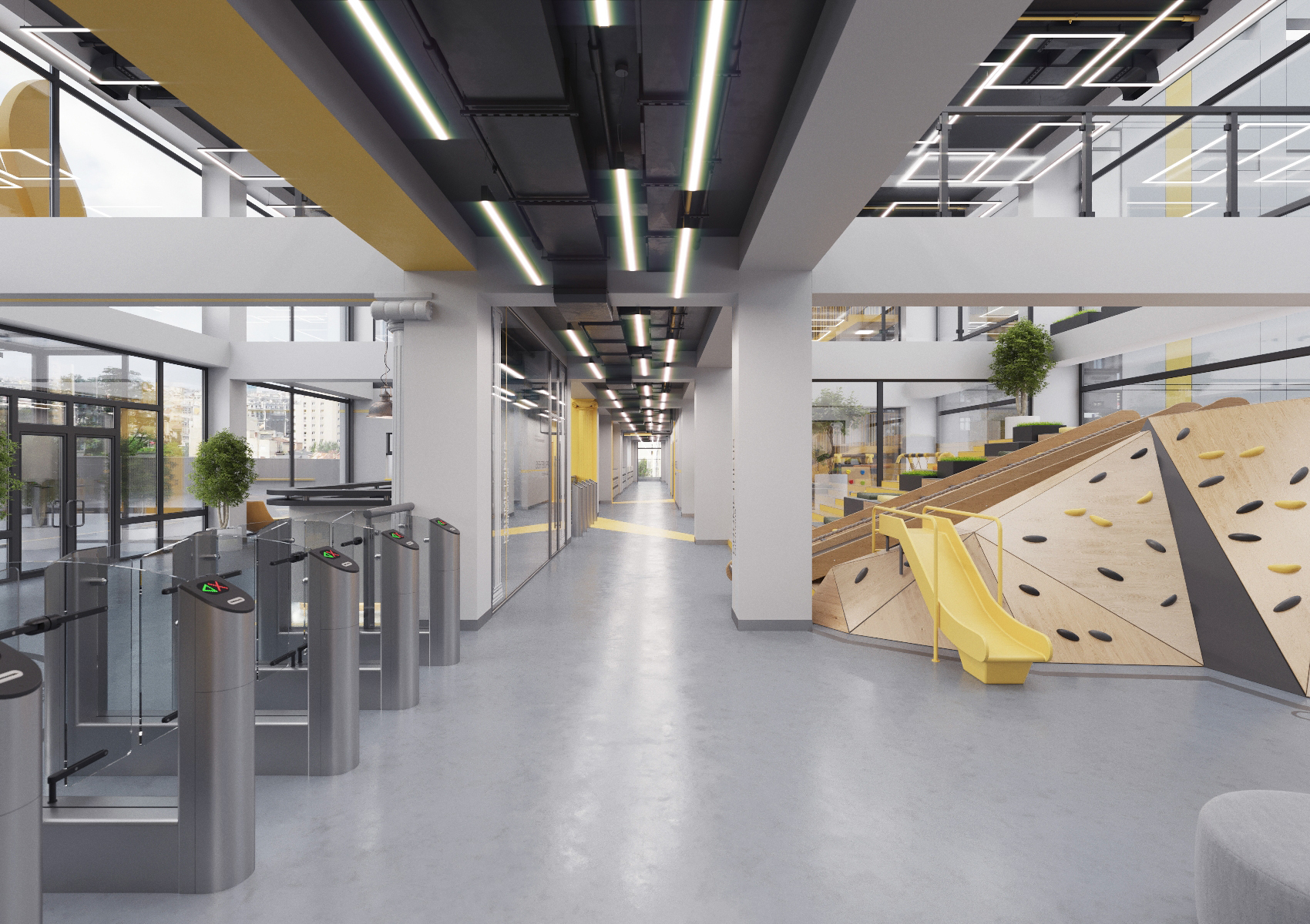 Современная школа, где наряду с комфортом и безопасностью реализованы смелые решения: например, горки-лифты для детей.