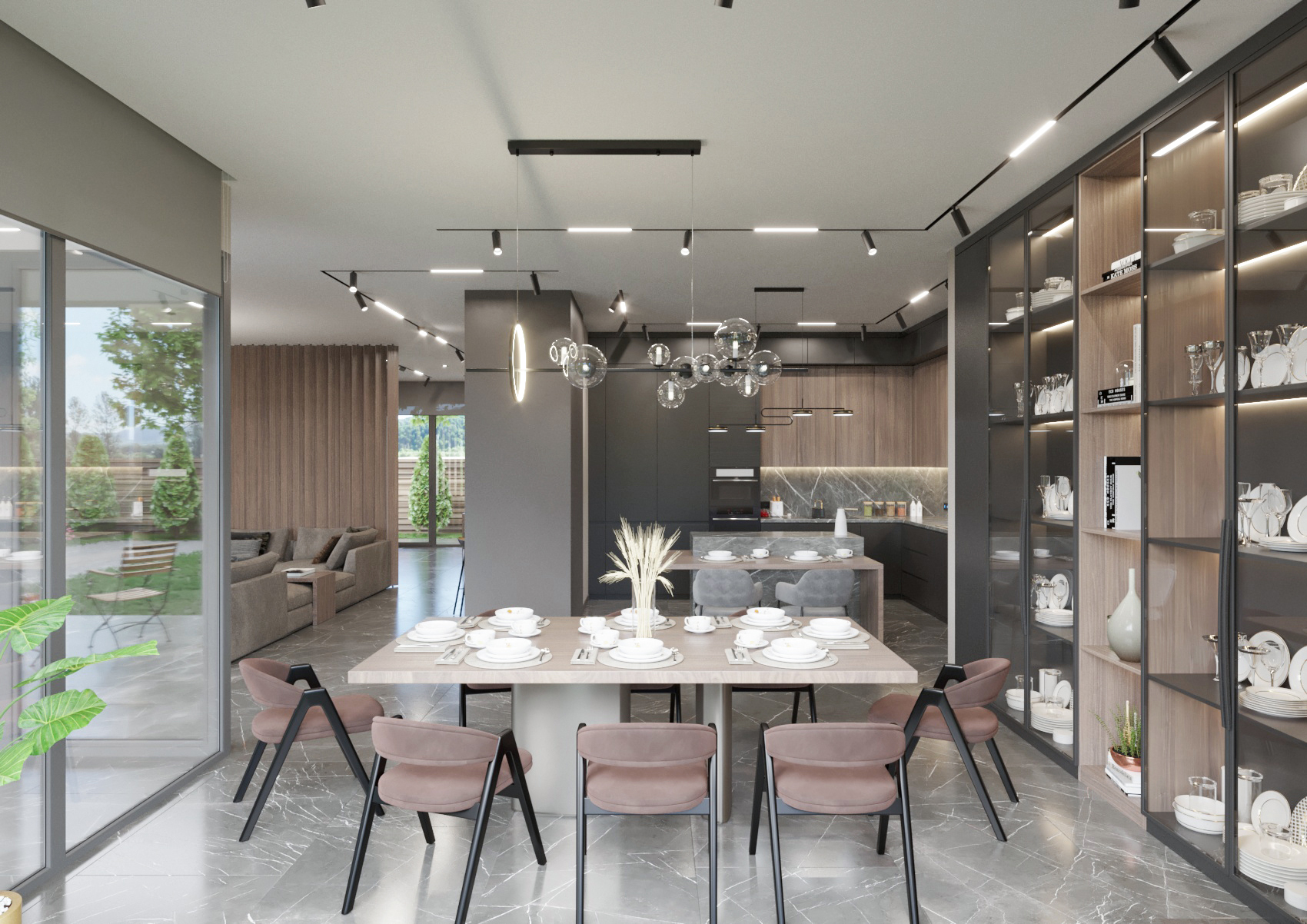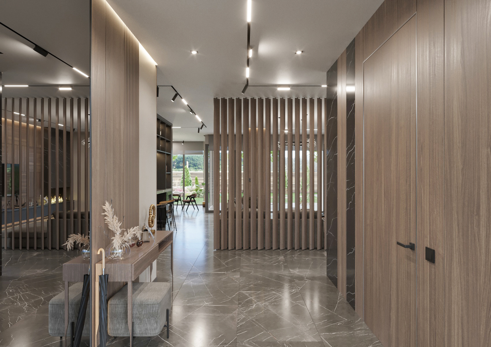 Люксовый модерн в темных оттенках с использованием природных материалов.
